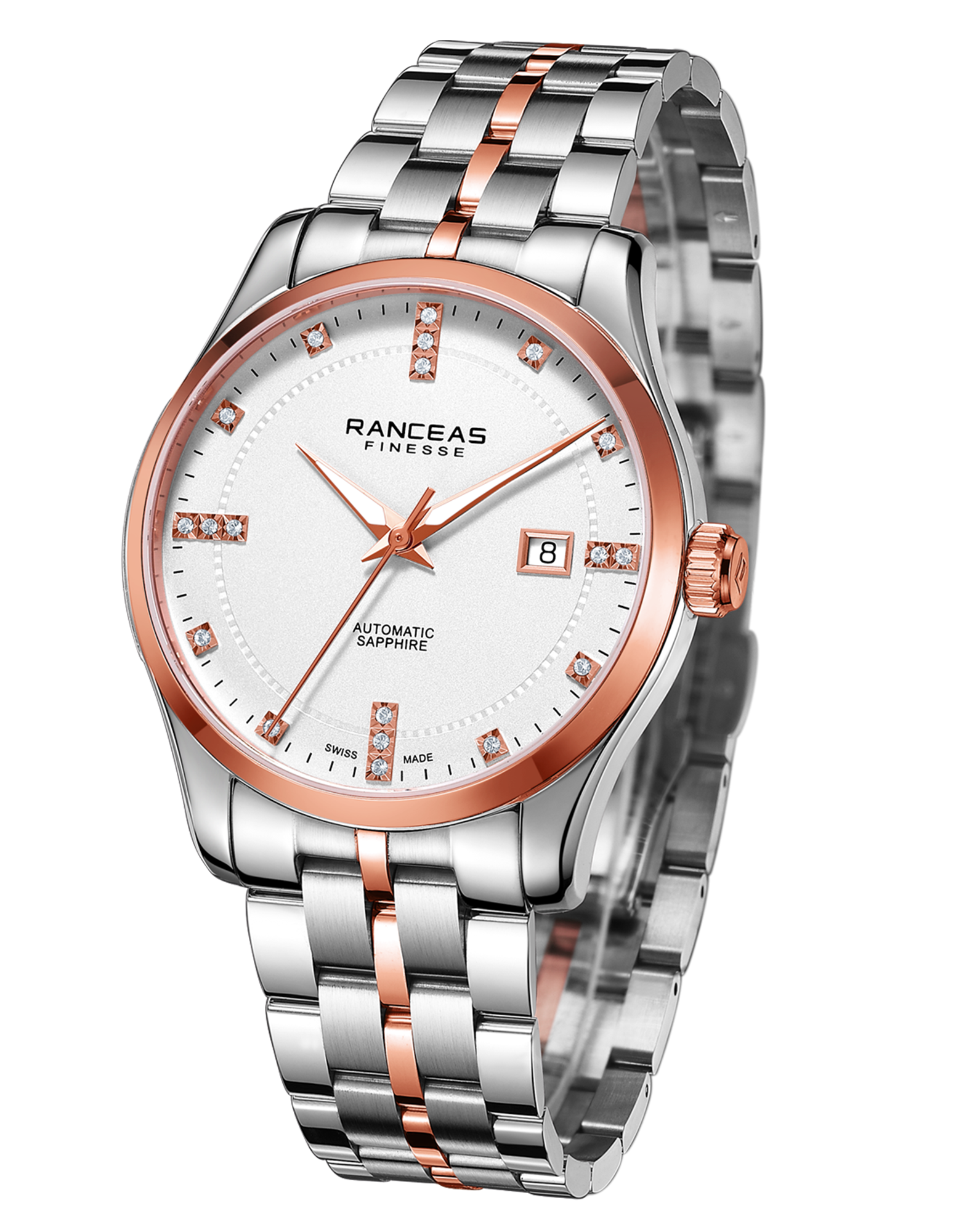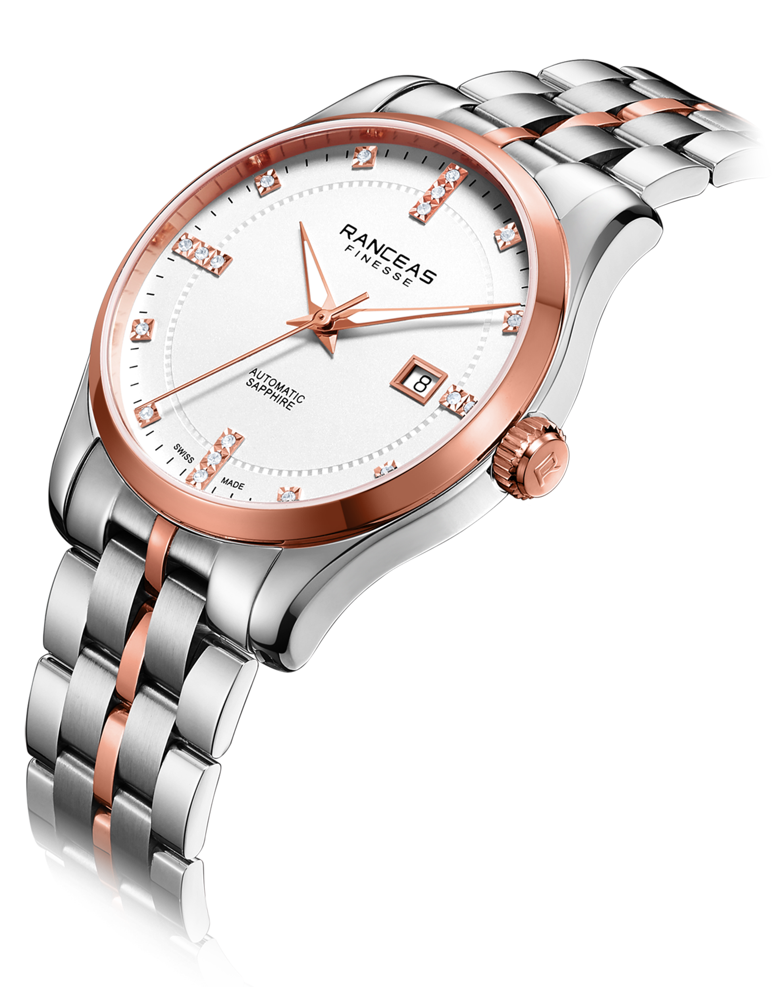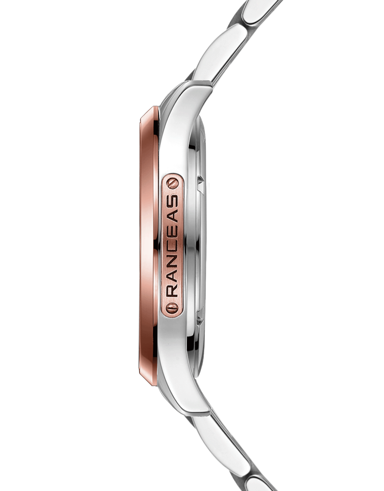 Stainless steel, Bezel covered with 18 karat pink gold, 18 karat pink gold slice inlaid on the side of the case