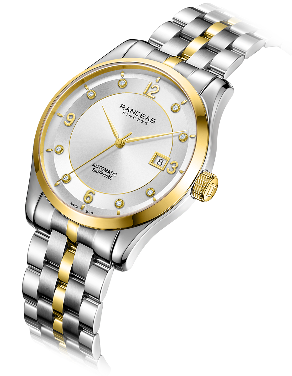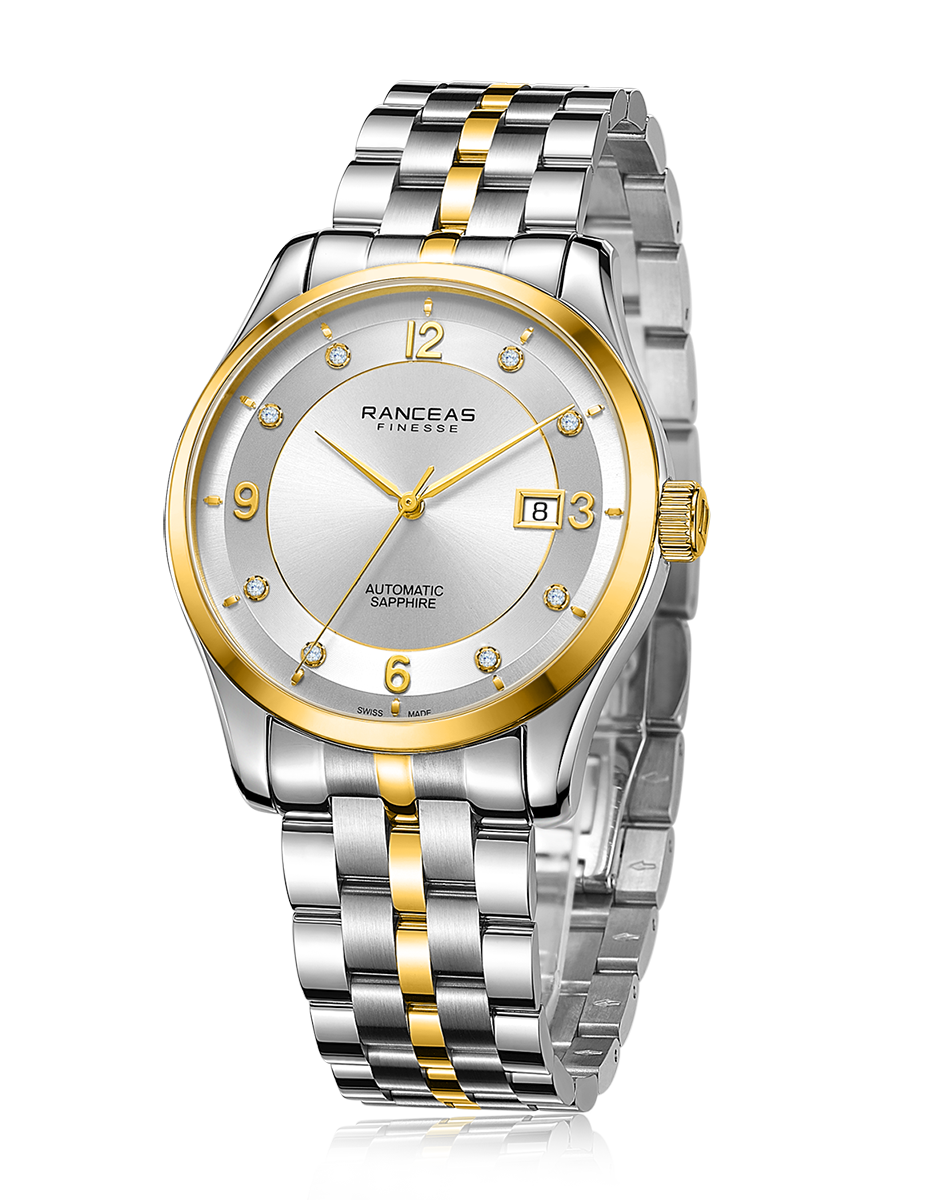 Stainless steel and Yellow PVD coating, 18 karat gold slice inlaid on the side of the case