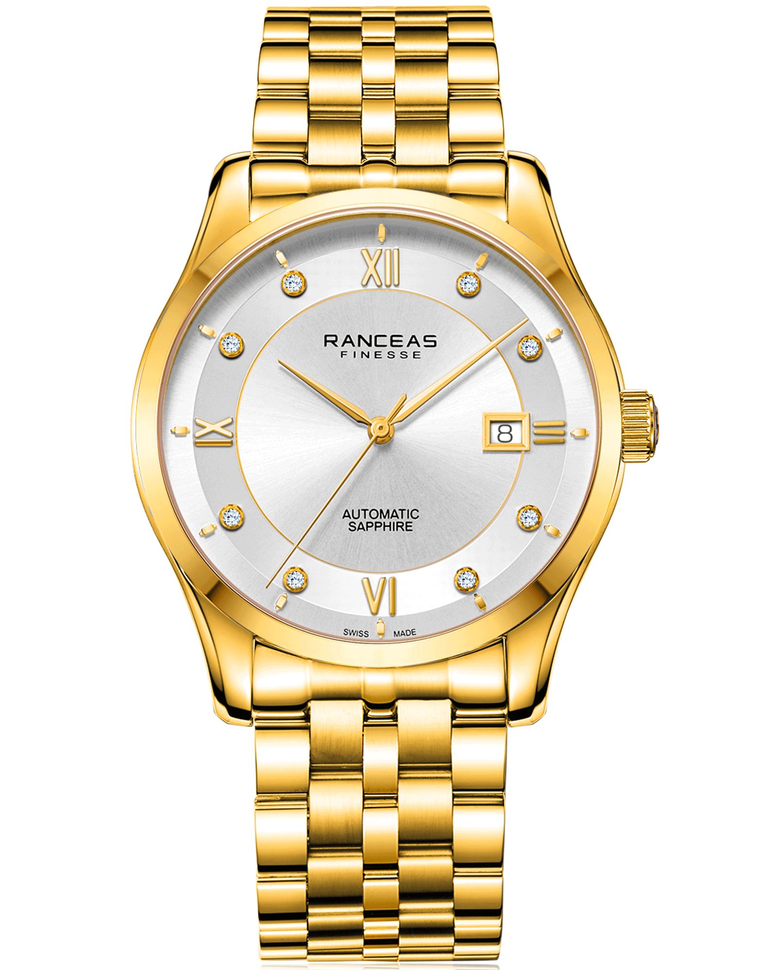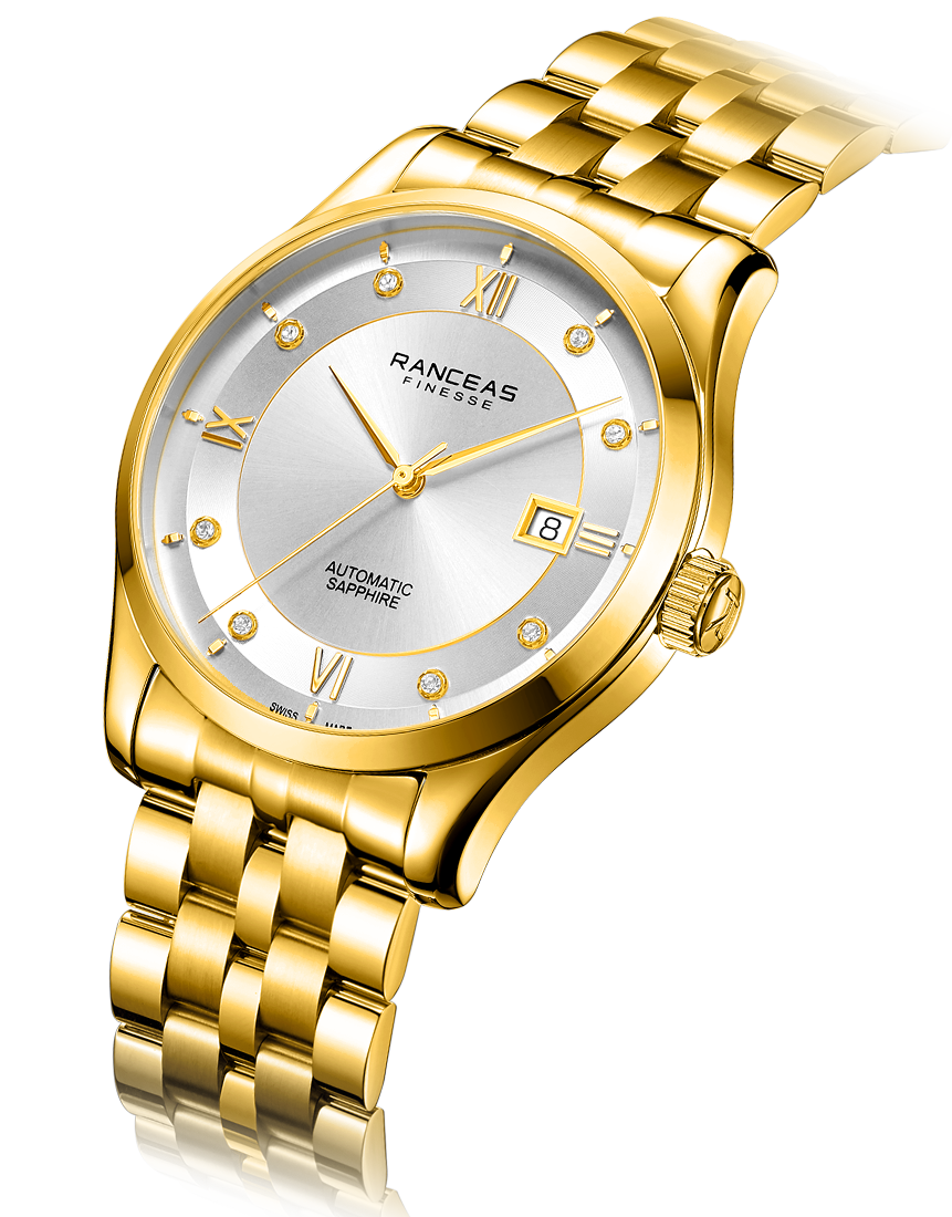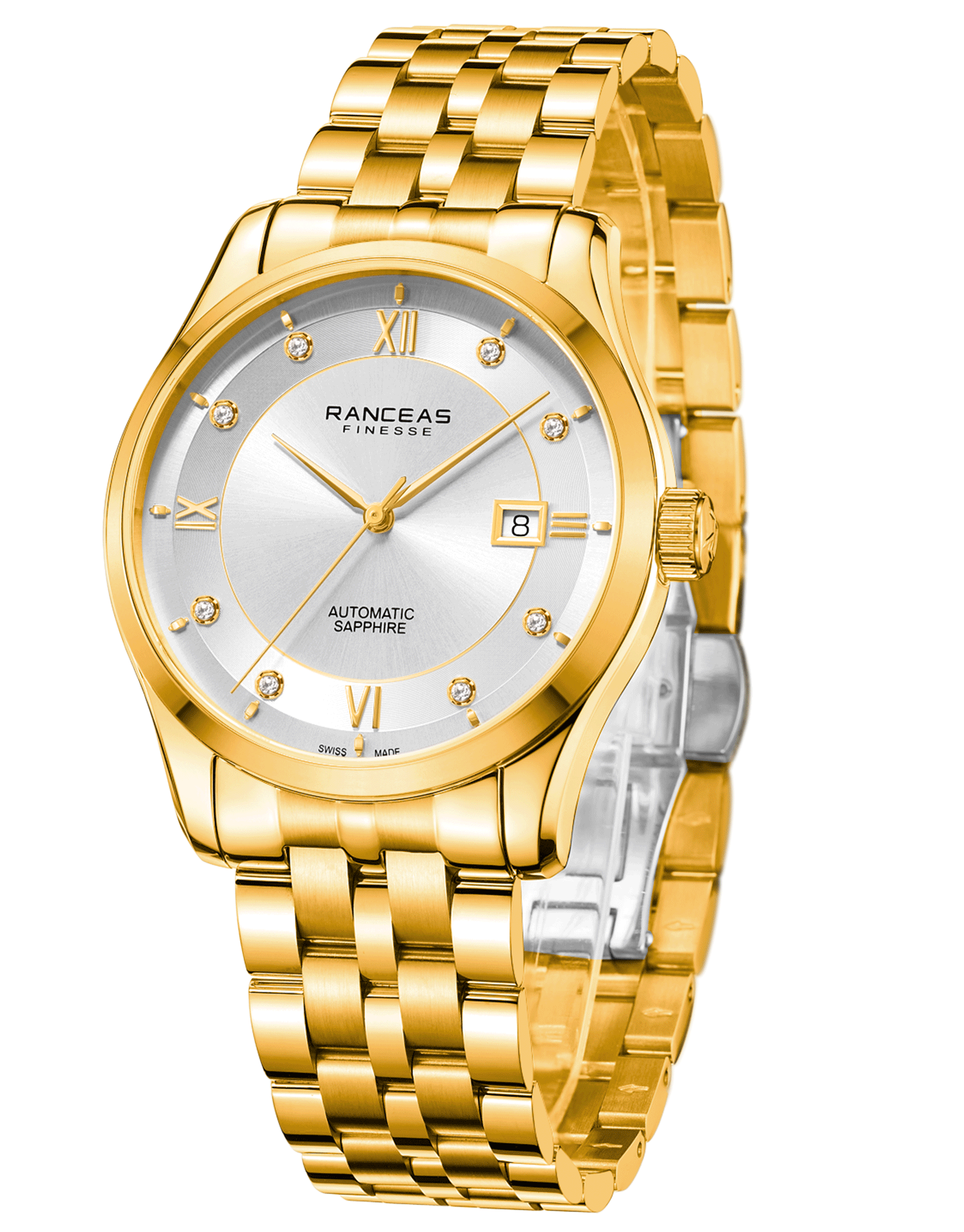 Stainless steel and Yellow PVD coating, 18 karat gold slice inlaid on the side of the case