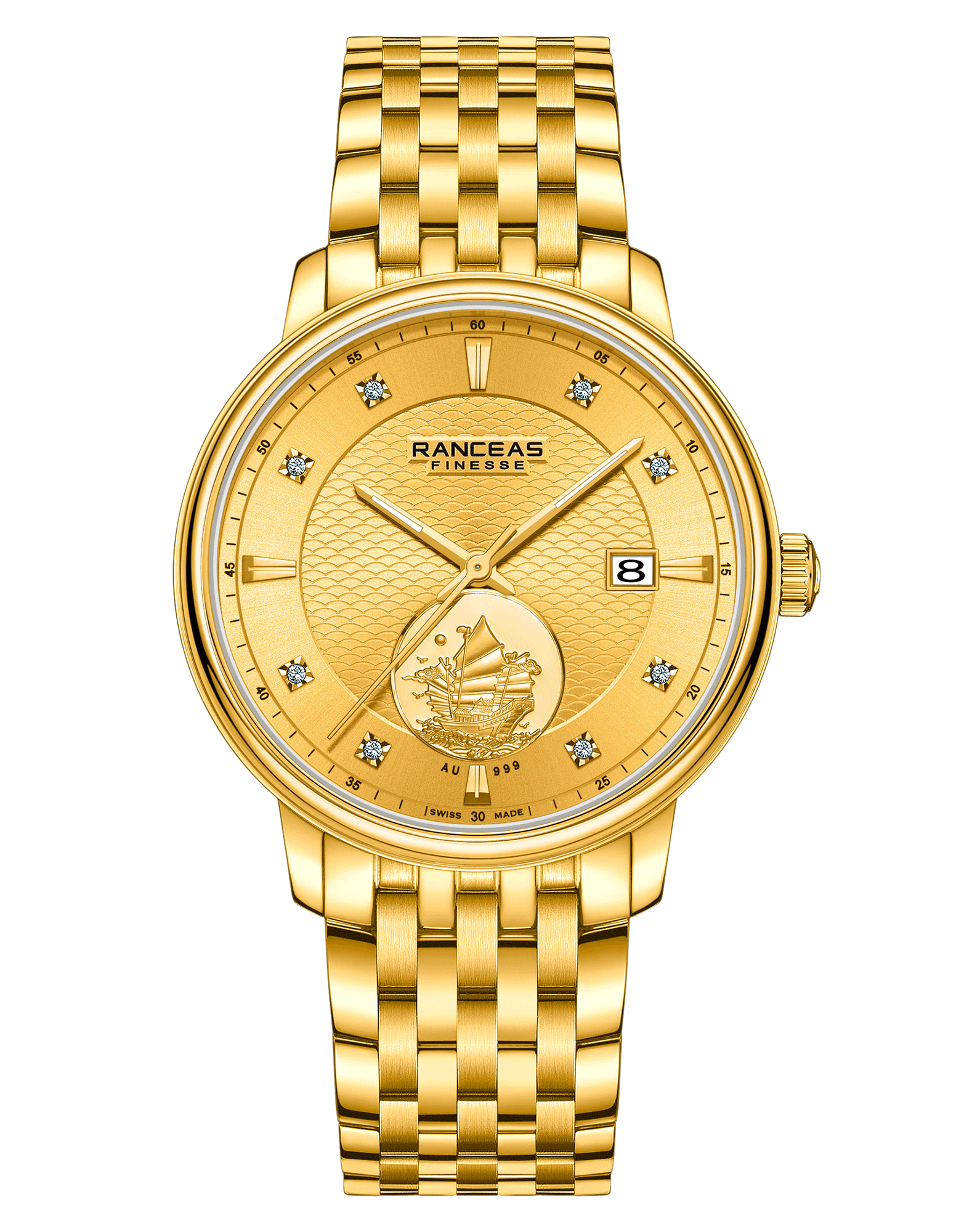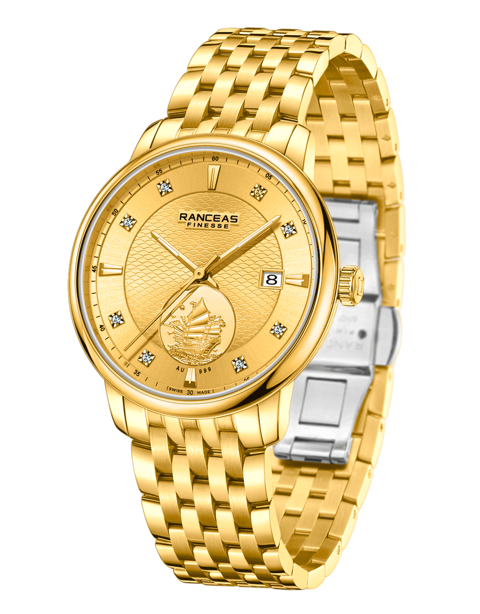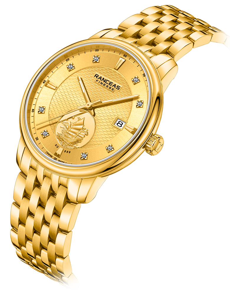 Stainless steel and yellow PVD coating, 18 karat gold slice inlaid on the side of the case