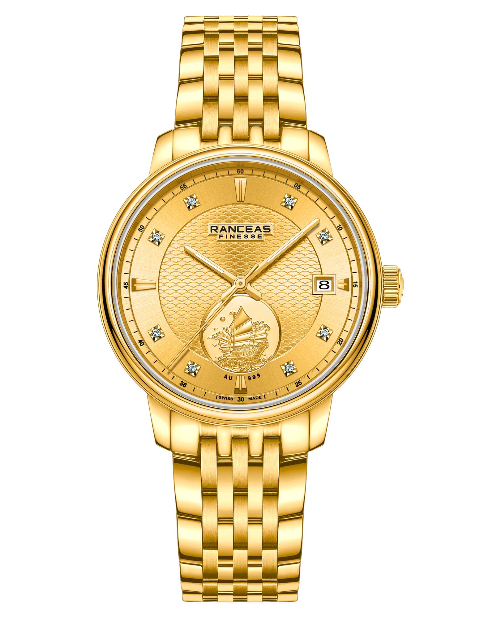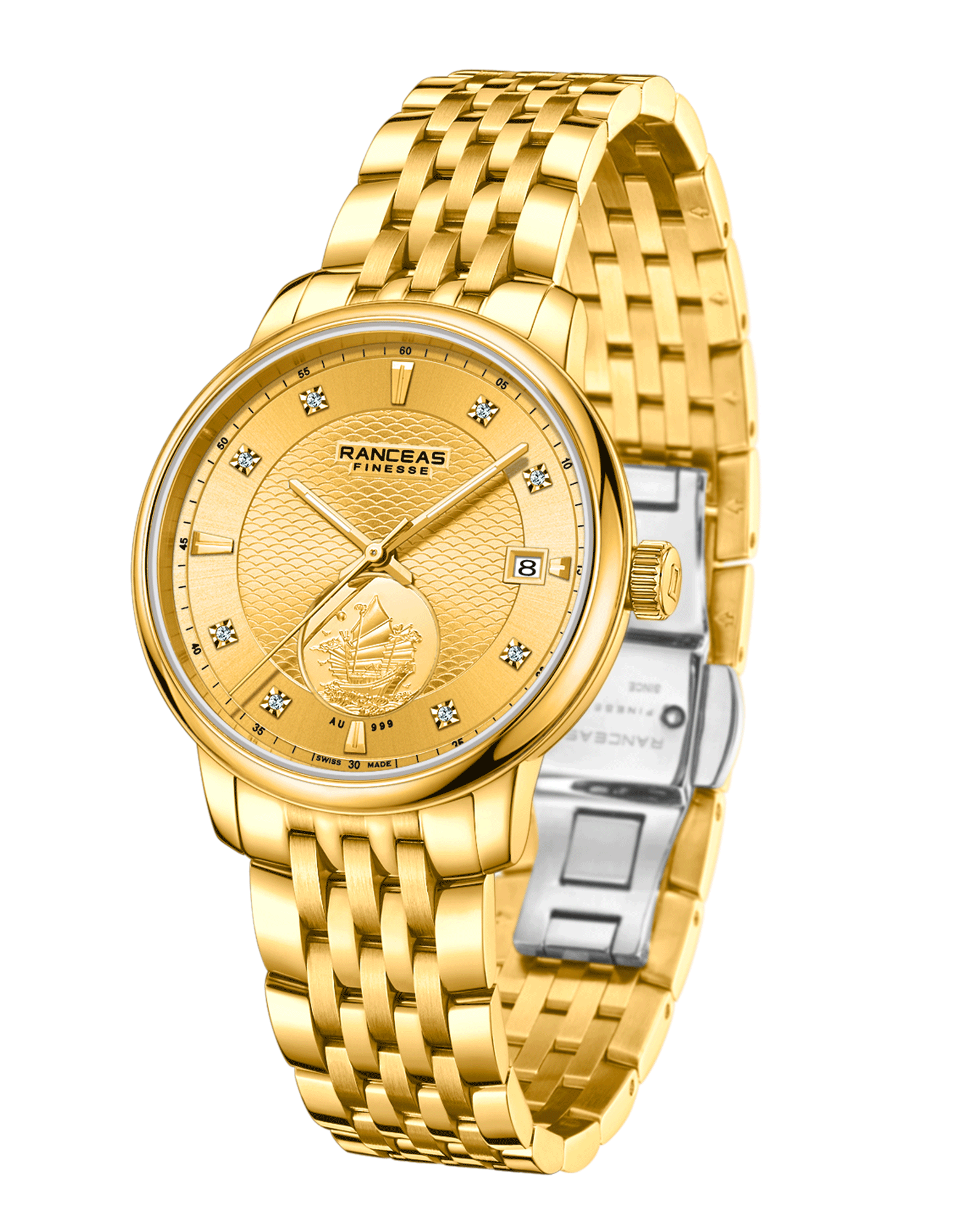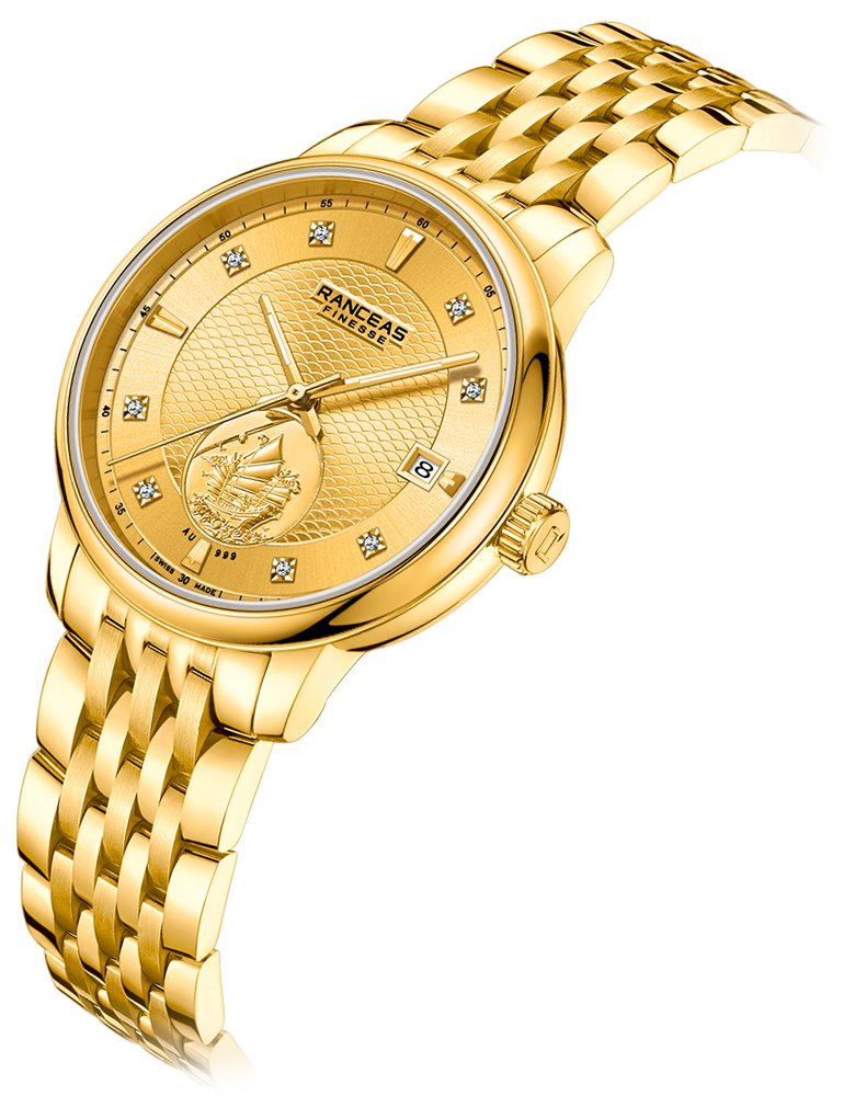 • Stainless steel and yellow PVD coating, 18 karat gold slice inlaid on the side of the case