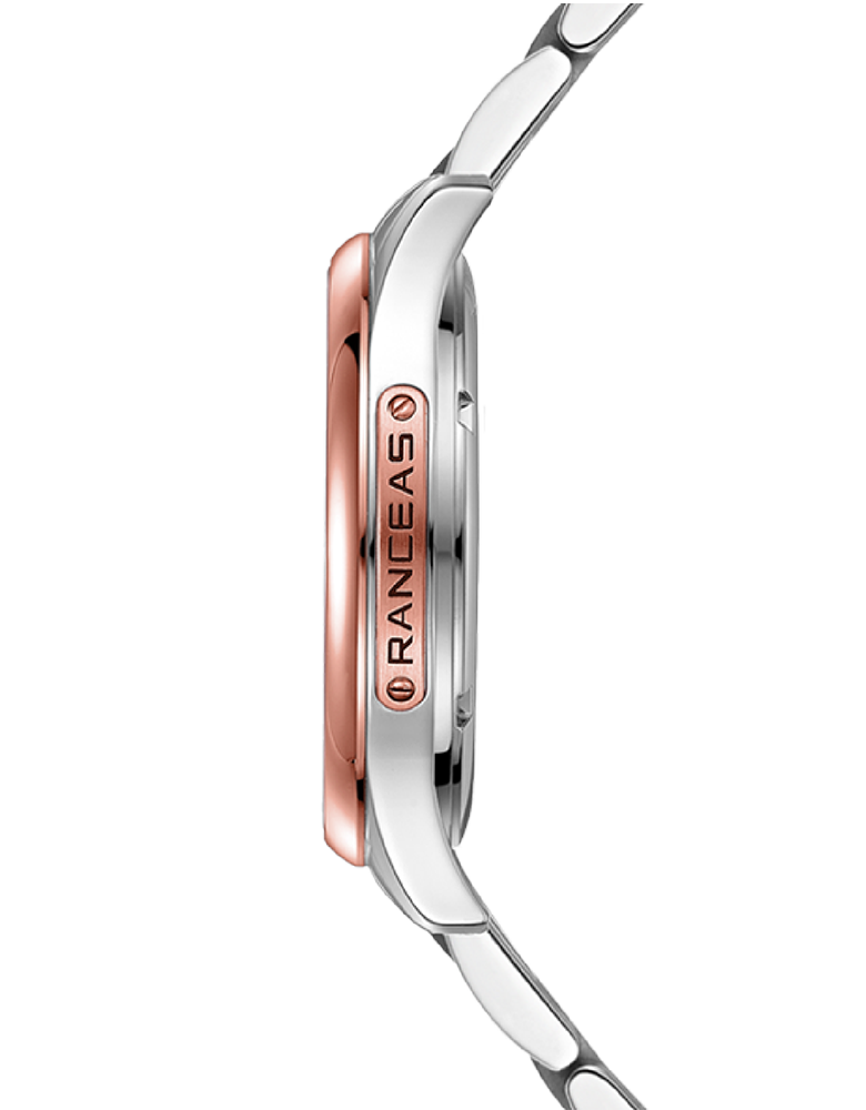 Stainless steel and Red PVD coating, 18 karat gold slice inlaid on the side of the case