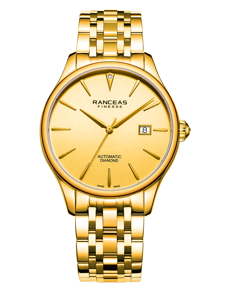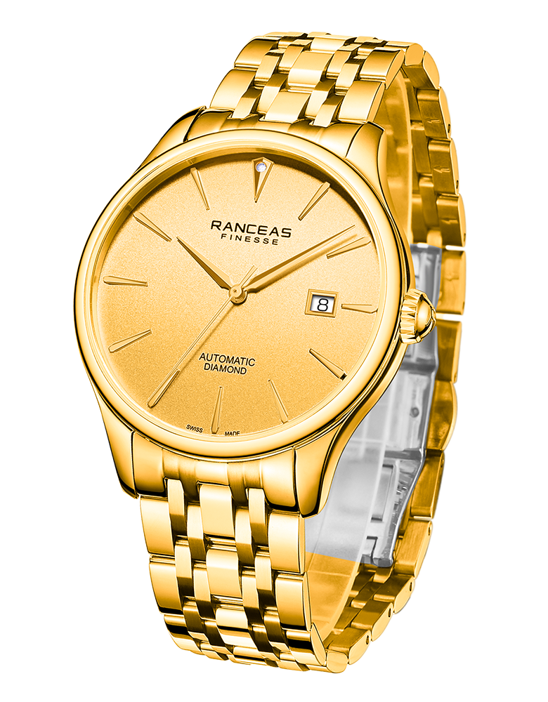 Stainless steel and yellow PVD coating, 18 karat gold slice inlaid on the side of the case