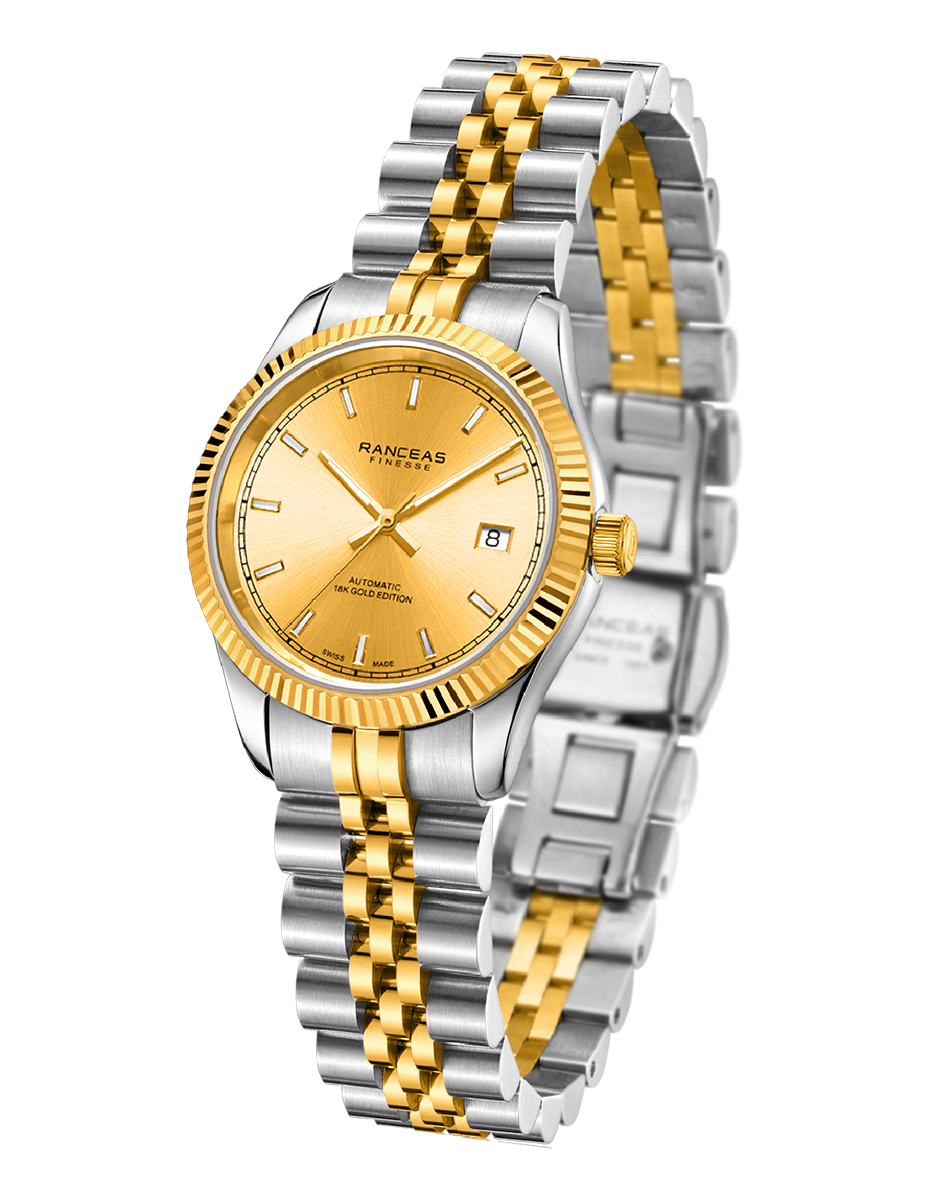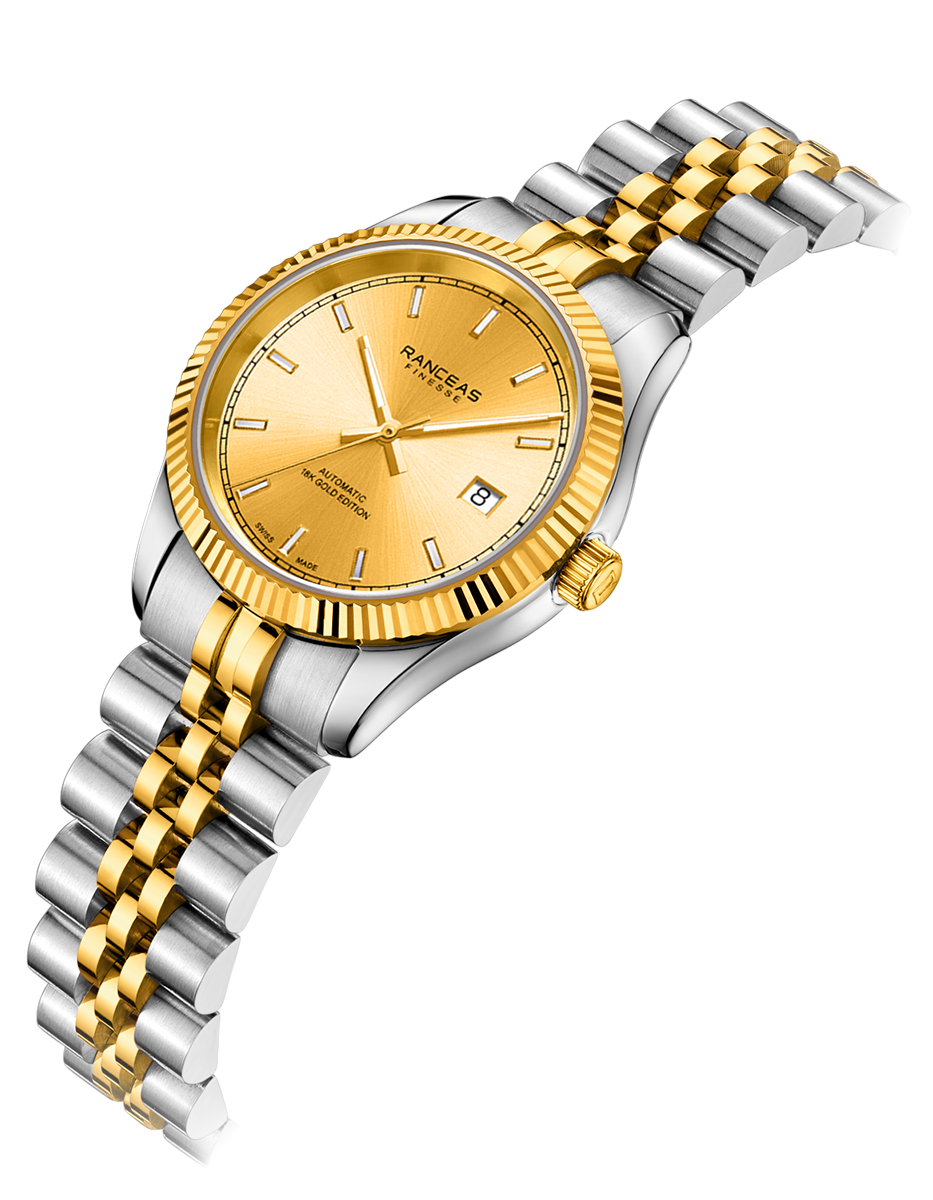 Stainless steel, Bezel covered with 18 karat gold